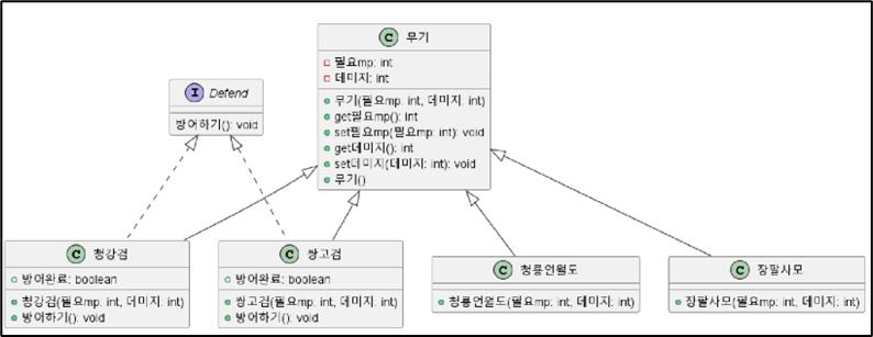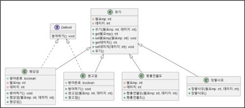 1) 무기클래스와 Player의 하위 클래스를 모두 삭제하고 무기들은 무기 클래스형의 객체로, 플레이어들은 Player 클래스형의 객체로 생성하면 어떨까? 무기 쌍고검, 무기 장팔사모, Player 관우, Player 유비 이런 식으로, 그러면 Defend 부분을 어떻게 처리해야 할지 모르겠고, 오히려 메인 코드가 복잡해질 것 같아서 포기했다.