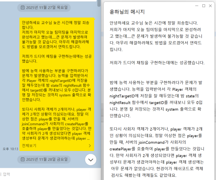 통신의 문제도 아니다. 우리는 join부터 계속 같은 로직으로 통신을 진행했다. 심지어 지금은 채팅도 매우 잘 된다. 이유를 알 수 없는 문제를 고치려니 정말 막막했다. 모든 코드를 보고 또 봤다. 나중에는 각자 AI들이랑 계속 대화를 나눴다. 코드가 많아서 AI한테 넣어주는 것도 쉽지 않았다.