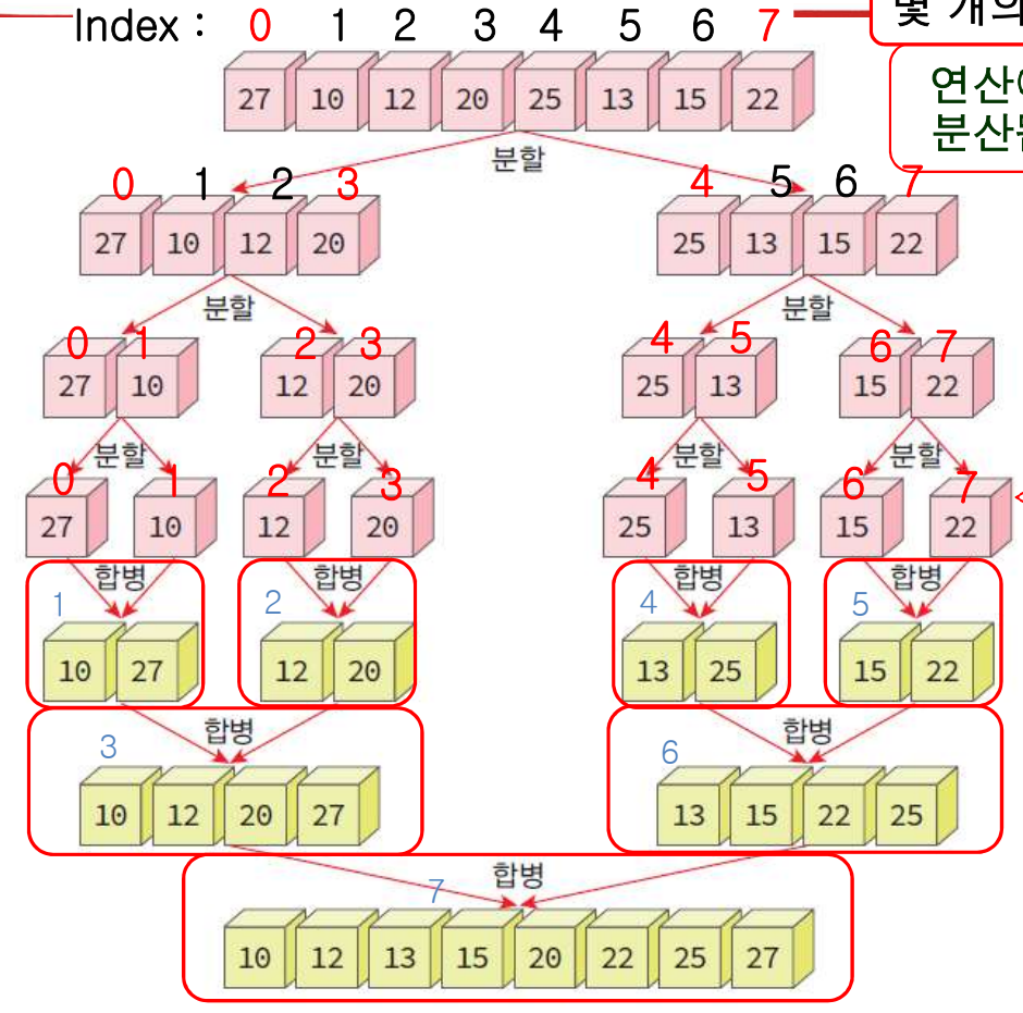 리스트를 절반으로 나누고 반반 먼저 정렬, 나눈 걸 합치면서 정렬