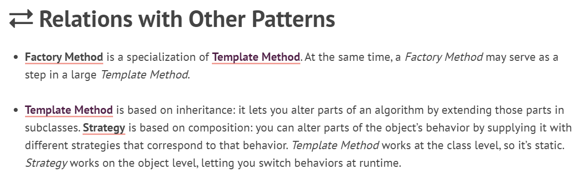 위 링크에 설명이 굉장히 잘 되어있다. 가장 인상적이었던 부분은 패턴 간의 관계이다. 수업 시간에 배웠던 팩토리 패턴이 템플릿 메소드 패턴과 비슷하다고 생각했는데 실제로 팩토리 패턴이 템플릿 메소드 패턴의 하위 패턴이라는 게 신기했다.